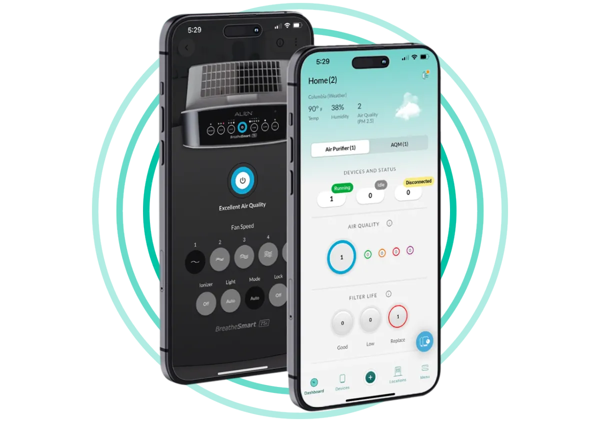 Powered by AI and connected with the Alen App, this technology uses smart sensors to give real-time insights to track pollen, dander, smoke, fire, and smog pollution.