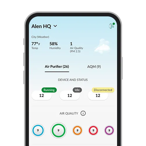 With the Alen Pure Air App, you can monitor trends, compare locations, identify issues faster, and validate performance 24/7. Leverage the live data from classroom air purifiers, air quality monitors, and airID for system-wide visibility.